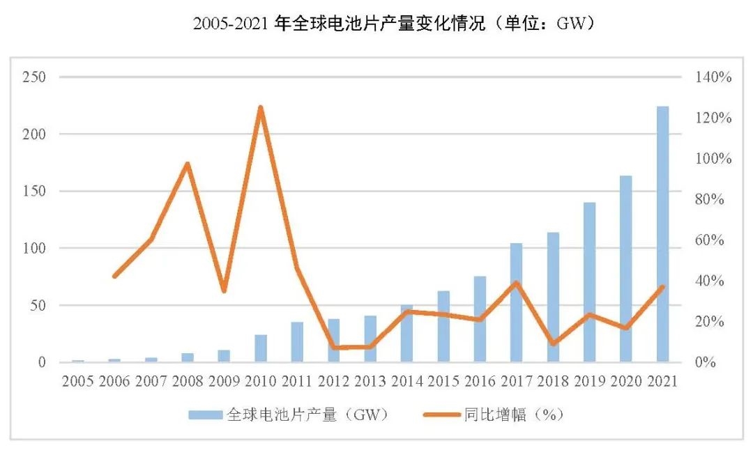 一、全球電池片產業(yè)發(fā)展情況 2021年太陽能電池片環(huán)節(jié)延續(xù)了2020年的擴產基調,產能大幅增加。全球晶硅太陽能電池片總產能達到423.5GW,同比增長69.8%;總產量為223.9GW,同比增長37%。 從產能情況看,頭部企業(yè)持續(xù)擴產,前十名全部為中國企業(yè)。天合光能、晶澳科技、晶科能源等也不斷擴大電...