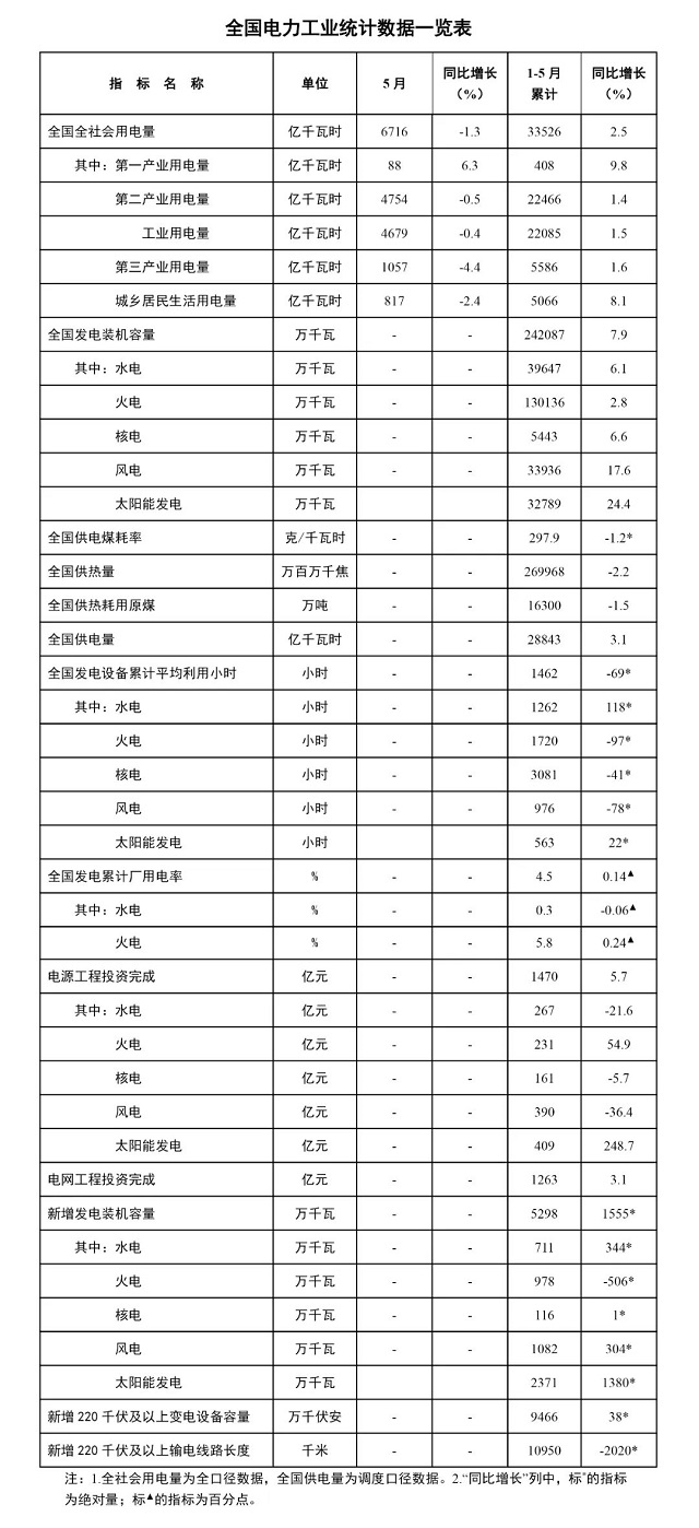 6月16日,國(guó)家能源局發(fā)布1-5月份全國(guó)電力工業(yè)統(tǒng)計(jì)數(shù)據(jù)。截至5月底,全國(guó)發(fā)電裝機(jī)容量約24.2億千瓦,同比增長(zhǎng)7.9%。其中,風(fēng)電裝機(jī)容量約3.4億千瓦,同比增長(zhǎng)17.6%;太陽(yáng)能發(fā)電裝機(jī)容量約3.3億千瓦,同比增長(zhǎng)24.4%。 1-5月份,全國(guó)發(fā)電設(shè)備累計(jì)平均利用1462小時(shí),比上年同期減少69...