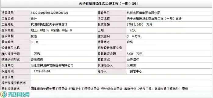 文章轉(zhuǎn)載于:環(huán)衛(wèi)科技網(wǎng)作者:ivy從這份核準(zhǔn)登記文件看,天子嶺填埋場生態(tài)治理工程建設(shè)單位為杭州市環(huán)境集團(tuán)有限公司,投資總額約1.75億元。筆者通過環(huán)衛(wèi)科技網(wǎng)數(shù)據(jù)平臺查詢后發(fā)現(xiàn),早在2021年8、9月間,天子嶺填埋場生態(tài)治理工程就已進(jìn)行過一次“場地調(diào)查服務(wù)項目”招標(biāo),彼時中標(biāo)單位為浙江大學(xué)建筑設(shè)計研究...