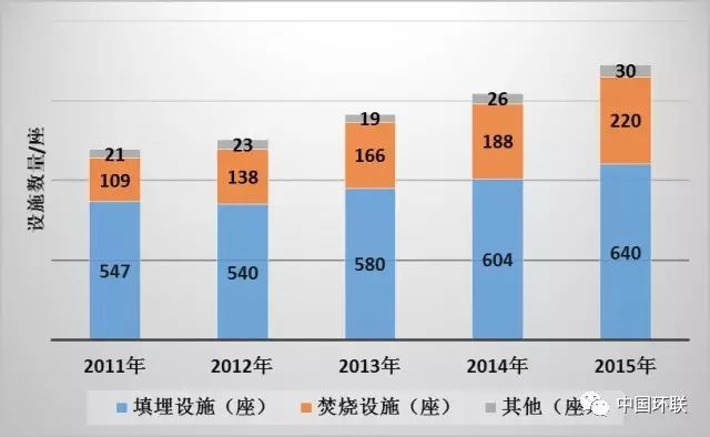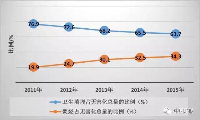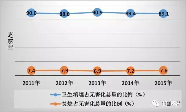 “十二五”期間縣城生活垃圾不同無害化技術處理比例,填埋比例一直穩(wěn)定在89%左右