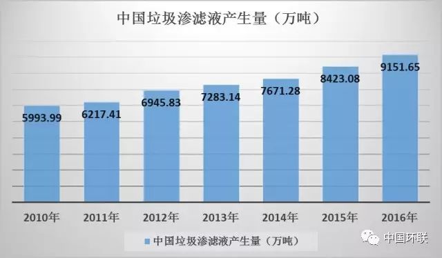 根據前瞻產業(yè)研究院發(fā)布的報告, 2016年,國內垃圾滲濾液產生量約為9152萬噸,日均產生量約為25萬噸。
