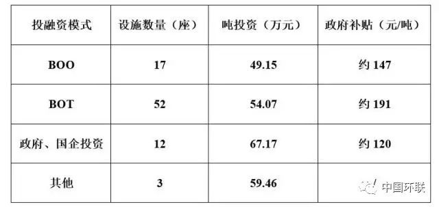 不同投融資模式餐廚垃圾處理設施的建設數量及噸投資情況