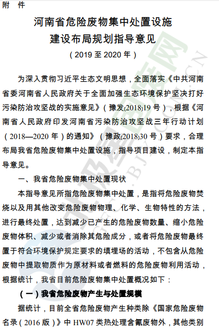 為深入貫徹習(xí)近平生態(tài)文明思想,全面落實(shí)《中共河南省委河南省人民政府關(guān)于全面加強(qiáng)生態(tài)環(huán)境保護(hù)堅(jiān)決打好污染防治攻堅(jiān)戰(zhàn)的實(shí)施意見》(豫發(fā)﹝2018﹞19號),根據(jù)《河南省人民政府印發(fā)河南省污染防治攻堅(jiān)戰(zhàn)三年行動計(jì)劃(2018—2020年)的通知》(豫政﹝2018﹞30號)要求,我廳起草了《河南省危險廢物集中處置設(shè)施建設(shè)布局規(guī)劃指導(dǎo)意見》,現(xiàn)印發(fā)給你們,請結(jié)合實(shí)際,認(rèn)真抓好落實(shí)。