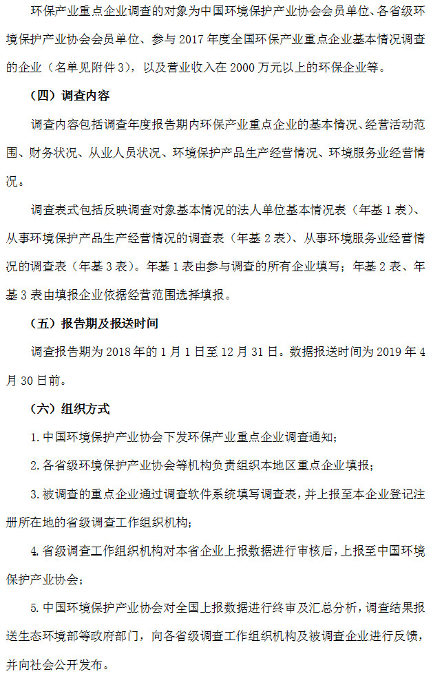 請?zhí)顖笃髽I(yè)登錄調(diào)查數(shù)據(jù)填報平臺http://www.caepi.net.cn/login_wwsb.jsp,下載并認真閱讀《全國環(huán)保產(chǎn)業(yè)重點企業(yè)基本情況調(diào)查方案》(附件1)及《填報指南》(附件2),依據(jù)填報要求填寫相關報表,并于2019年4月25日前完成數(shù)據(jù)上報。