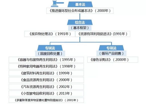20世紀(jì)90年代,日本政府又制定一系列法律:《促進(jìn)再生資源利用法》、《容器包裝循環(huán)法》、《環(huán)境基本法》等。
