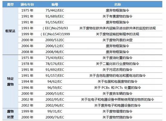 歐盟通過廢棄物框架指令確立了固廢處理的理念,建立了固廢處理體系,其相關(guān)的環(huán)境法律政策實(shí)際由兩部分組成,一部分是各類指令,從法律上直接對(duì)各成員國起約束作用,另一部分是定期頒布的環(huán)境行動(dòng)規(guī)劃,對(duì)各成員國進(jìn)行目標(biāo)、內(nèi)容上的指導(dǎo)。