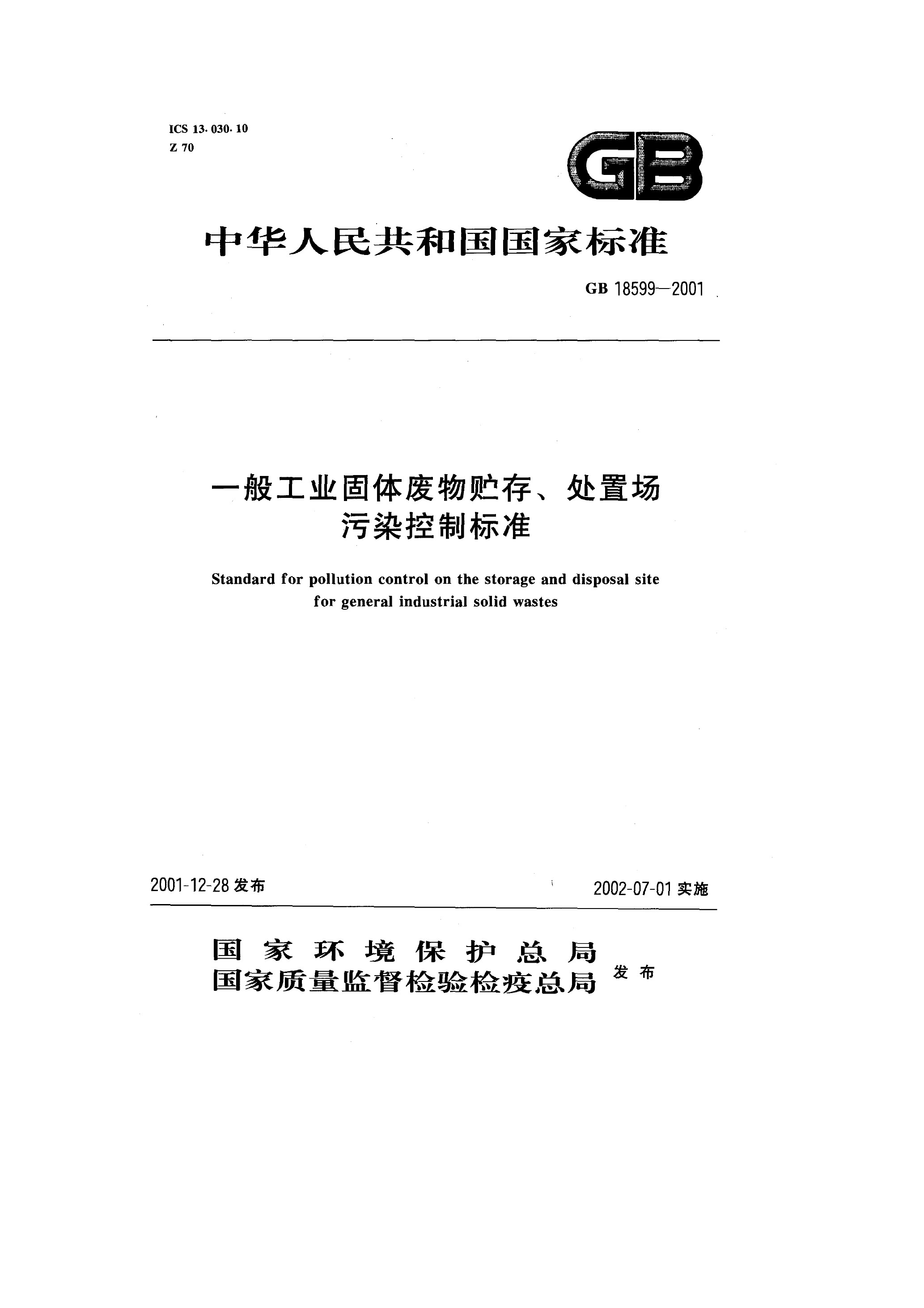 一般工業(yè)固體廢物貯存、處置場(chǎng)污染控制標(biāo)準(zhǔn)(GB 18599-2001)