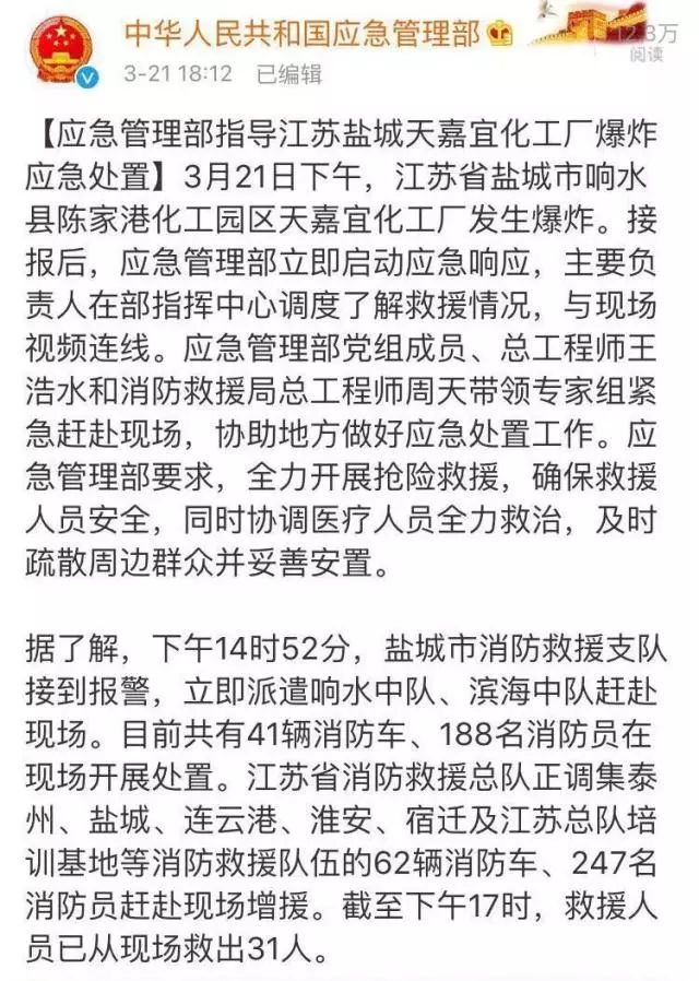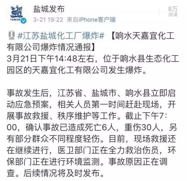 事故發(fā)生后,江蘇省、鹽城市、響水縣立即啟動應(yīng)急預(yù)案,相關(guān)人員第一時間趕赴現(xiàn)場,開展事故救援、秩序維護(hù)等工作。截至3月21日下午7:00,確認(rèn)事故已造成死亡6人,重傷30人,另有部分群眾不同程度輕傷。目前,現(xiàn)場救援還在繼續(xù)進(jìn)行,醫(yī)衛(wèi)部門正在全力救治傷員,環(huán)保部門正在進(jìn)行環(huán)境監(jiān)測。事故原因正在調(diào)查。后續(xù)情況將及時發(fā)布。