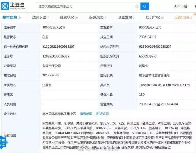 企查查數(shù)據(jù)顯示:江蘇天嘉宜化工有限公司成立于2007年,陶在明任法定代表人,注冊資本9000萬人民幣,經(jīng)營范圍包括間羥基苯甲酸、苯甲醚、KSS等精細(xì)化工產(chǎn)品制造、化工產(chǎn)品銷售等業(yè)務(wù)。