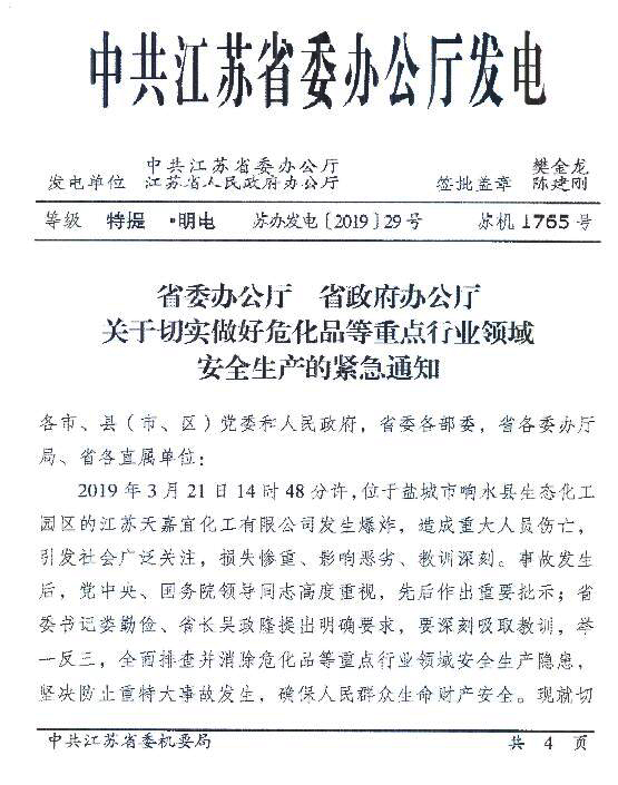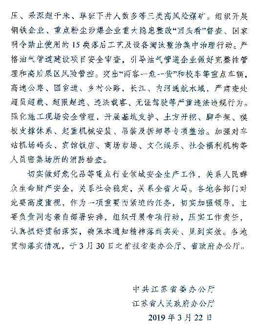 江蘇省發(fā)布《關(guān)于切實(shí)做好?;返戎攸c(diǎn)行業(yè)領(lǐng)域安全生產(chǎn)的緊急通知》,要深入開(kāi)展“263”和化工企業(yè)“四個(gè)一批”專項(xiàng)行動(dòng),嚴(yán)格落實(shí)“三個(gè)一律不批”。規(guī)范新改擴(kuò)建化工項(xiàng)目準(zhǔn)入,提高門檻和設(shè)防等級(jí),防止工藝技術(shù)落后、安全環(huán)保風(fēng)險(xiǎn)高、資源利用效率低、產(chǎn)能過(guò)剩等項(xiàng)目的低水平重復(fù)建設(shè)。嚴(yán)格行政許可標(biāo)準(zhǔn),對(duì)不符合標(biāo)準(zhǔn)規(guī)范的,一律不予許可。深入開(kāi)展重點(diǎn)企業(yè)本質(zhì)安全專項(xiàng)行動(dòng),提高自動(dòng)化控制水平。