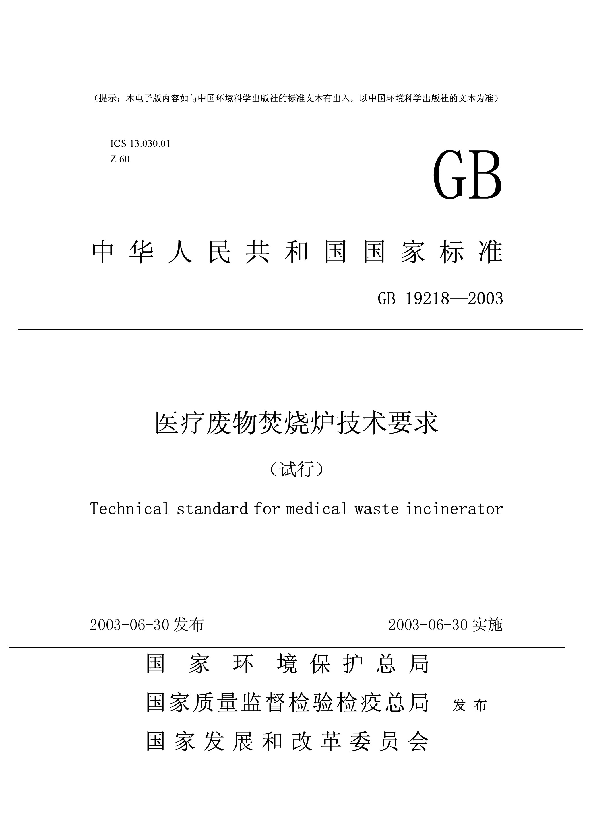 醫(yī)療廢物焚燒爐技術(shù)要求(試行)(GB 19218-2003)
