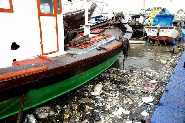 Versova海灘的部分垃圾來自于附近的街區(qū),而更大一部分來自于默拉得河(Malad Creek)的雨水排水管。河面看起來仍然很漂亮,但實際上,遠岸的紅樹林,以及停靠在高水位的漁船間隙中,是成堆成堆的垃圾。