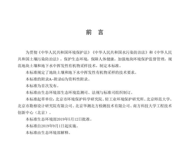 為貫徹《中華人民共和國(guó)環(huán)境保護(hù)法》《中華人民共和國(guó)水污染防治法》和《中華人民共和國(guó)土壤污染防治法》,保護(hù)生態(tài)環(huán)境,保障人體健康,加強(qiáng)地塊環(huán)境保護(hù)監(jiān)督管理,規(guī)范地塊土壤和地下水中揮發(fā)性有機(jī)物采樣技術(shù),制定本標(biāo)準(zhǔn)。本標(biāo)準(zhǔn)規(guī)定了地塊土壤和地下水中揮發(fā)性有機(jī)物采樣的技術(shù)要求。本標(biāo)準(zhǔn)的附錄A~附錄G為資料性附錄。本標(biāo)準(zhǔn)為首次發(fā)布。