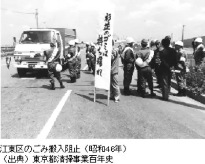 另一方面,江東區(qū)政府和區(qū)民也慢慢意識(shí)到,都政府關(guān)于垃圾填埋到1970年為止的承諾,根本沒(méi)有實(shí)現(xiàn)的可能性。到了1971年,平均每天有5000輛以上的搬運(yùn)車(chē),將東京中心23區(qū)所生產(chǎn)的垃圾中的70%搬運(yùn)到江東區(qū)進(jìn)行填埋。由此產(chǎn)生的交通堵塞、蚊蟲(chóng)叢生、空氣污染甚至是火災(zāi),給江東區(qū)區(qū)民的日常生活造成重大困擾。