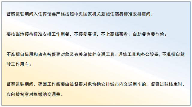 也就是說,環(huán)保督察工作也將參照此標準。而《中央生態(tài)環(huán)境保護督察紀律規(guī)定》也從差旅、住宿、接待、交通工具使用等方面提出了具體要求。包括: