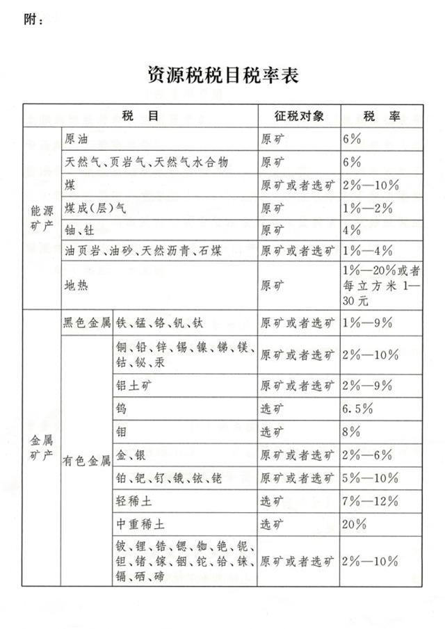 應(yīng)稅資源的具體范圍,由本法所附《資源稅稅目稅率表》(以下稱《稅目稅率表》)確定。