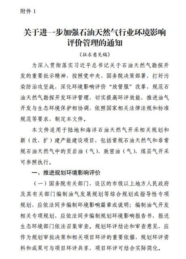 附件:1.《關(guān)于進一步加強石油天然氣行業(yè)環(huán)境影響評價管理的通知(征求意見稿)》