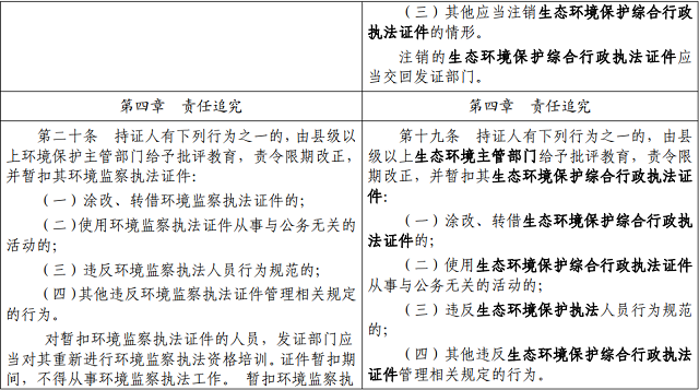 第十九條 持證人有下列行為之一的,由縣級(jí)以上生態(tài)環(huán)境主管部門給予批評(píng)教育,責(zé)令限期改正,并暫扣其生態(tài)環(huán)境保護(hù)綜合行政執(zhí)法證件: