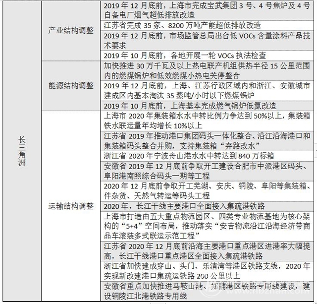 長三角地區(qū)——①調整化工、鋼鐵等產業(yè)結構,加大VOCs綜合治理水平②控制煤炭消耗量,開展生物質鍋爐整治③調整貨物運輸結構,淘汰老舊車船,加強車用油品監(jiān)管。
