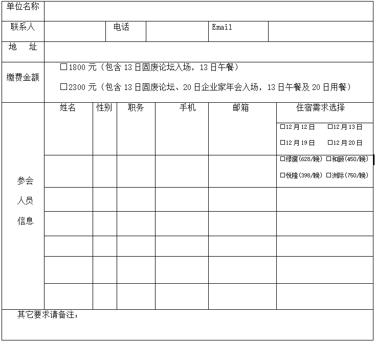 參會(huì)代表交通及住宿費(fèi)用自理。請(qǐng)將注冊(cè)費(fèi)匯款到指定賬戶并于2019年12月11日前并發(fā)參會(huì)回執(zhí)(附件2)至?xí)?wù)組郵箱:zghl@envirunion.com。