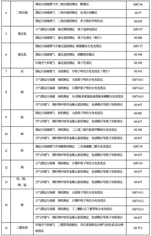 8.2.4 大氣污染物濃度監(jiān)測時(shí)的測定方法采用表5所列的方法標(biāo)準(zhǔn)。本標(biāo)準(zhǔn)實(shí)施后國家發(fā)布的污染物監(jiān)測方法標(biāo)準(zhǔn),如適用性滿足要求,同樣適用于本標(biāo)準(zhǔn)相應(yīng)污染物的測定。