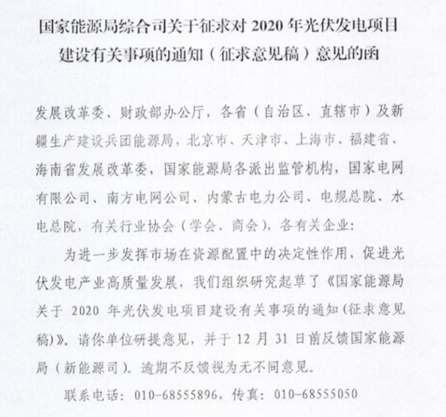 2019年12月16日,國家能源局印發(fā)《關(guān)于征求對2020年光伏發(fā)電項目建設(shè)有關(guān)事項的通知(征求意見稿)意見的函》(簡稱“通知”),其中包括五大主要內(nèi)容,明確2020年競價項目配置工作總體思路、項目管理、競爭配置方法仍按2019年工作方案執(zhí)行。
