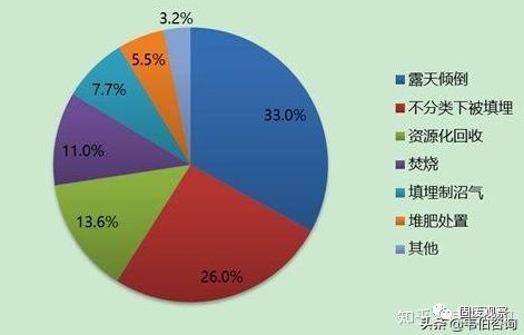 根據(jù)世界銀行報告,2016年,全球垃圾的末端處置方式有露天傾倒、填埋(不分類、沼氣化、控制)、焚燒、堆肥、資源化回收。有33%的垃圾未加處理被露天傾倒,26%的垃圾不分類下被填埋掉,7.7%的垃圾填埋制沼氣,11%的垃圾被焚燒,5.5%垃圾堆肥處置,13.6%垃圾進(jìn)行了資源化回收。