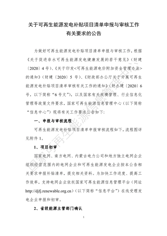 原標題:關于可再生能源發(fā)電補貼項目清單申報與審核工作有關要求的公告