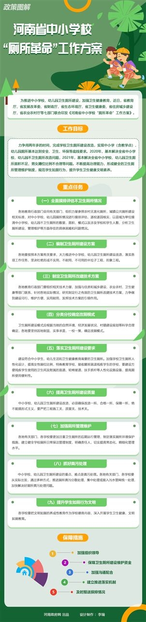 根據(jù)《教育部辦公廳等七部門關(guān)于印發(fā)<中小學校“廁所革命”行動計劃>的通知》(教發(fā)廳〔2019〕8號)精神,為切實做好我省中小學“廁所革命”工作,省教育廳七部門等結(jié)合我省實際制定了《河南省中小學校“廁所革命”工作方案》,現(xiàn)印發(fā)給你們,請認真組織實施。
