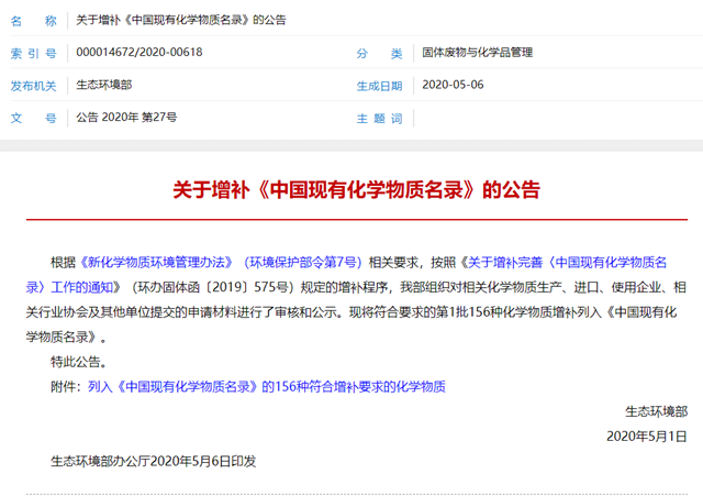 生態(tài)環(huán)境部于5月6日發(fā)布關(guān)于增補(bǔ)《中國現(xiàn)有化學(xué)物質(zhì)名錄》的公告,將符合要求的第1批156種化學(xué)物質(zhì)增補(bǔ)列入《中國現(xiàn)有化學(xué)物質(zhì)名錄》。詳情如下: