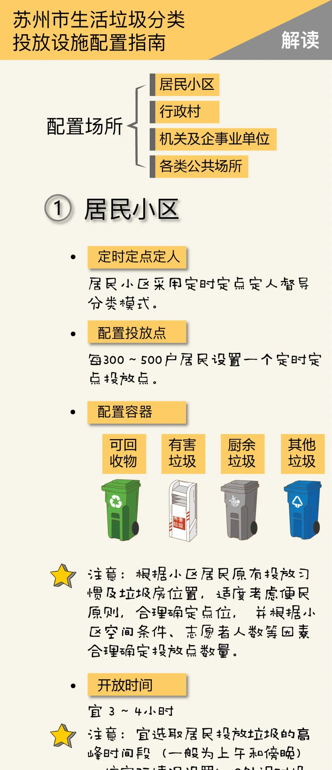 生活垃圾分類投放設施配置應與區(qū)域分類收集、分類運輸、分類處理系統(tǒng)和生活垃圾產(chǎn)生量、收運頻率要求相適應。本文匯總了有關(guān)蘇州市生活垃圾投放設施配置的知識,供大家參閱。