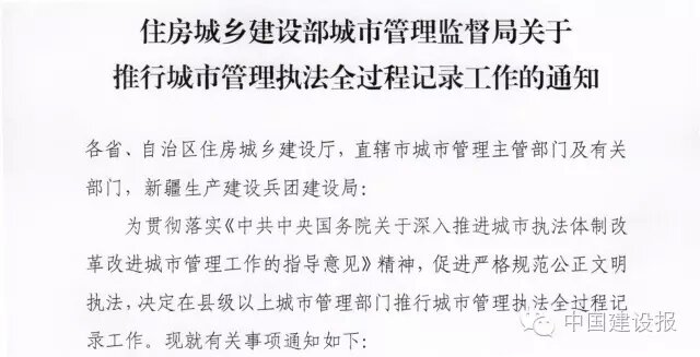 各省、自治區(qū)住房城鄉(xiāng)建設(shè)廳,直轄市城市管理主管部門(mén)及有關(guān)部門(mén),新疆生產(chǎn)建設(shè)兵團(tuán)建設(shè)局:為貫徹落實(shí)《中共中央國(guó)務(wù)院關(guān)于深入推進(jìn)城市執(zhí)法體制改革改進(jìn)城市管理工作的指導(dǎo)意見(jiàn)》精神,促進(jìn)嚴(yán)格規(guī)范公正文明執(zhí)法,決定在縣級(jí)以上城市管理部門(mén)推行城市管理執(zhí)法全過(guò)程記錄工作?,F(xiàn)就有關(guān)事項(xiàng)通知如下:各地城市管理部門(mén)要通過(guò)文字、音像等記錄方式,對(duì)執(zhí)法活動(dòng)全過(guò)程進(jìn)行記錄,客觀、公正、完整地記錄執(zhí)法工作情況和相關(guān)證據(jù),實(shí)現(xiàn)全過(guò)程留痕和可回溯管理。規(guī)范執(zhí)法文書(shū)的制作和使用,確保執(zhí)法文書(shū)和案卷完整準(zhǔn)確、合法規(guī)范。合理配備并使用執(zhí)法記錄儀等現(xiàn)場(chǎng)執(zhí)法記錄設(shè)備和視音頻資料傳輸、存儲(chǔ)、等設(shè)備。對(duì)現(xiàn)場(chǎng)執(zhí)法活動(dòng)中容易引發(fā)爭(zhēng)議和糾紛的,應(yīng)當(dāng)實(shí)行全過(guò)程音像記錄。積極利用大數(shù)據(jù)、云計(jì)算、物聯(lián)網(wǎng)等信息技術(shù),結(jié)合數(shù)字化城市管理平臺(tái)建設(shè)和辦公自動(dòng)化系統(tǒng)建設(shè)等,探索成本低、效果好、易保存、不能刪改的音像記錄方式,提高執(zhí)法記錄的信息化水平。做好執(zhí)法文書(shū)和視音頻資料的管理和存儲(chǔ),逐步實(shí)現(xiàn)與數(shù)字化城市管理信息系統(tǒng)關(guān)聯(lián)共享。建立健全執(zhí)法全過(guò)程記錄保存、管理、使用等工作制度。定期組織對(duì)執(zhí)法文書(shū)和視音頻資料進(jìn)行抽查檢查。充分發(fā)揮全過(guò)程記錄信息在案卷評(píng)查、數(shù)據(jù)統(tǒng)計(jì)分析、執(zhí)法監(jiān)督等工作中的作用。各地要充分認(rèn)識(shí)推行城市管理執(zhí)法全過(guò)程記錄工作的重要意義,切實(shí)落實(shí)工作要求,配備相關(guān)儀器設(shè)備,嚴(yán)格規(guī)范記錄行為,妥善保管使用記錄信息,確保執(zhí)法全過(guò)程記錄工作有效推行。住房城鄉(xiāng)建設(shè)部城市管理監(jiān)督局