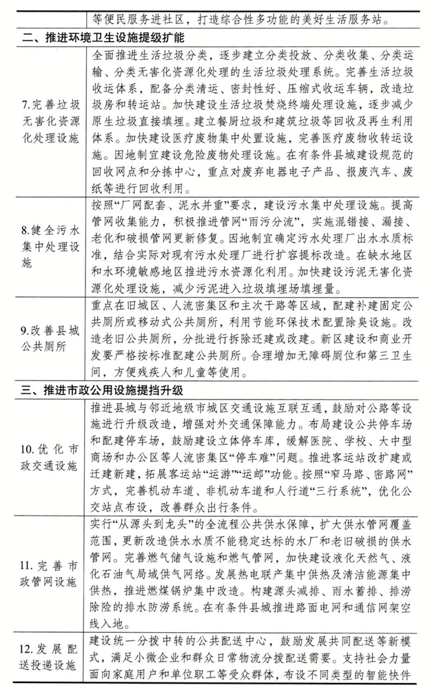 (二)明晰建設領域。各地區(qū)要瞄準市場不能有效配置資源、需要政府支持引導的公共領域,聚力推進17項建設任務。圍繞公共服務設施提標擴面,優(yōu)化醫(yī)療衛(wèi)生設施、教育設施、養(yǎng)老托育設施、文旅體育設施、社會福利設施和社區(qū)綜合服務設施。圍繞環(huán)境衛(wèi)生設施提級擴能,完善垃圾無害化資源化處理設施、污水集中處理設施和縣城公共廁所。圍繞市政公用設施提擋升級,推進市政交通設施、市政管網設施、配送投遞設施、老舊小區(qū)更新改造和縣城智慧化改造。圍繞產業(yè)培育設施提質增效,完善產業(yè)平臺配套設施、冷鏈物流設施和農貿市場。