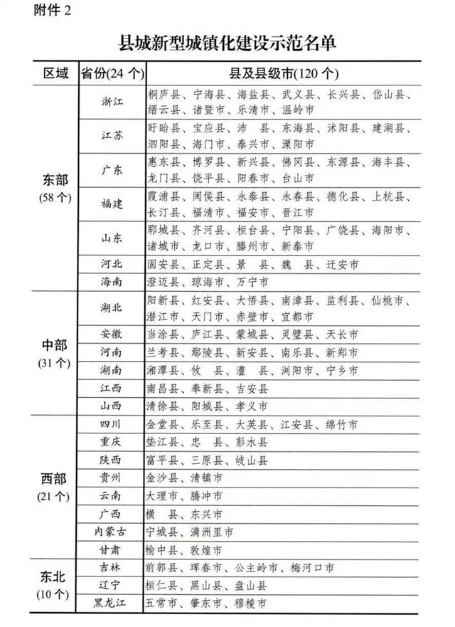 (十)強化示范帶動。以發(fā)展基礎扎實、財政實力較強、政府債務率較低為基本要求,在湖北、長江三角洲區(qū)域、粵港澳大灣區(qū)和其他東中部都市圈地區(qū),兼顧西部和東北地區(qū),選擇120個縣及縣級市開展縣城新型城鎮(zhèn)化建設示范工作(附件2)。切實加大中央財政性資金等政策支持力度,支持其圍繞縣城城鎮(zhèn)化補短板強弱項項目范疇,啟動建設示范性項目,創(chuàng)新資金投入方式與運營模式??偨Y提煉典型經驗,以現(xiàn)場會、典型案例推介等方式加以推廣。