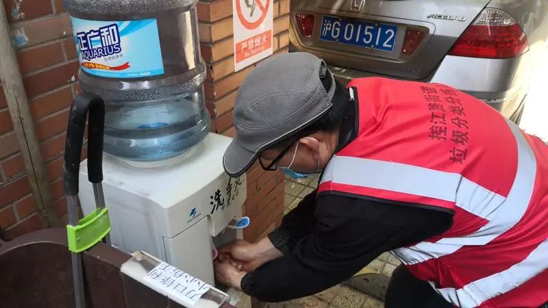 鳳六新苑垃圾投放點(diǎn)旁沒有條件裝洗手臺(tái)盆,小區(qū)物業(yè)經(jīng)理劉昌澄看了一眼閑置的飲水機(jī),“就你了!”居民破袋時(shí)如果臟了手,就翻起垃圾桶旁飲水機(jī)上的把手,涓涓細(xì)流很快沖走了他們的煩惱。