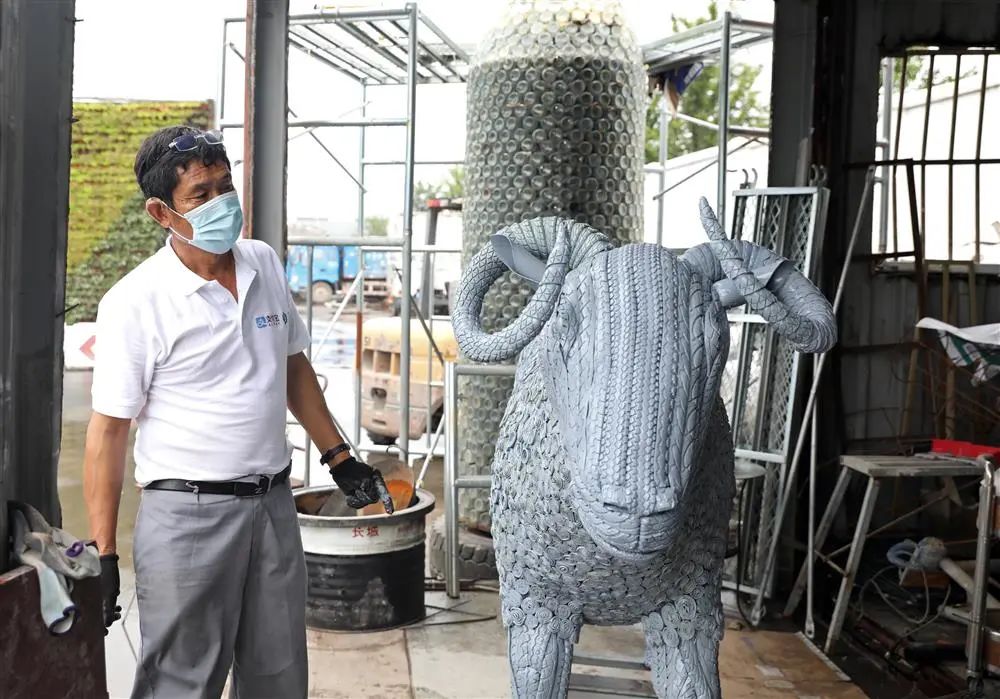 閔行區(qū)浦錦街道的兩網(wǎng)融合中轉(zhuǎn)服務(wù)站里,輪胎、金屬構(gòu)件等可回收物被制作成各種頗具觀賞價(jià)值的“公共家具”,放置在口袋公園、小區(qū)花園里 李茂君 攝