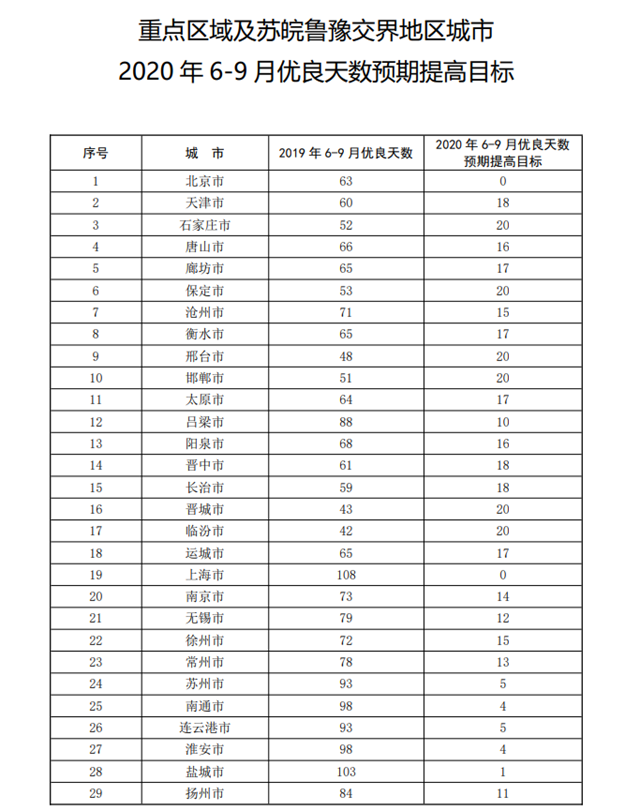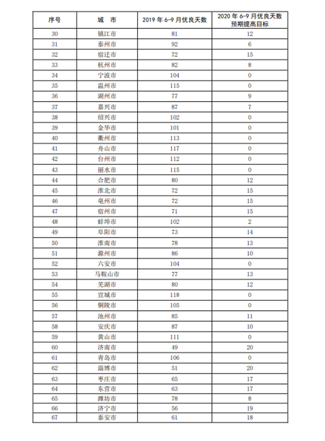 2.重點區(qū)域及蘇皖魯豫交界地區(qū)城市2020年6-9月優(yōu)良天數(shù)預期提高目標