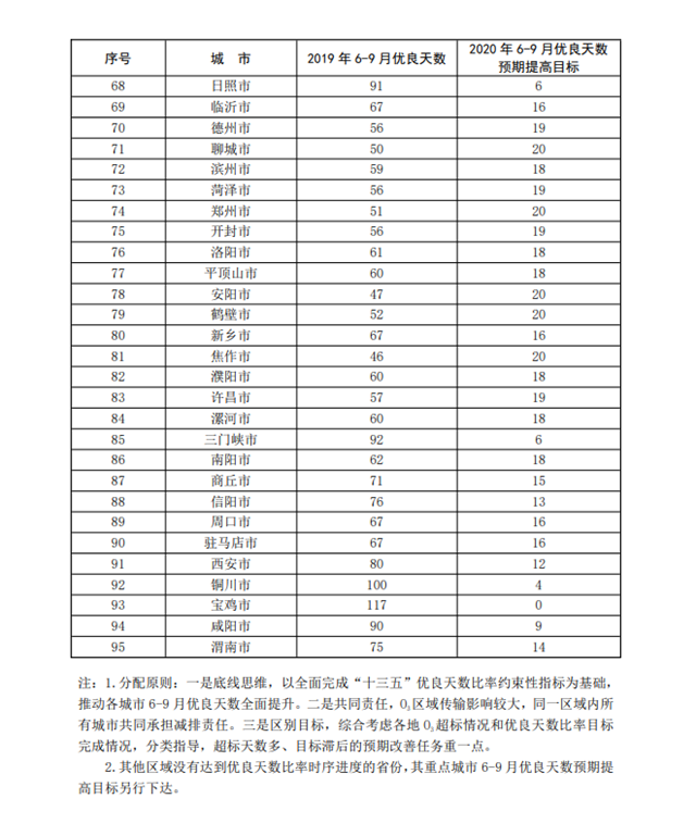 工作目標:通過攻堅行動,VOCs治理能力顯著提升,VOCs排放量明顯下降,夏季O3污染得到一定程度遏制,重點區(qū)域、蘇皖魯豫交界地區(qū)及其他O3污染防治任務重的地區(qū)城市6-9月優(yōu)良天數(shù)平均同比增加11天左右(各城市預期性目標詳見附件2),推動“十三五”規(guī)劃確定的各省(區(qū)、市)優(yōu)良天數(shù)比率約束性指標全面完成(詳見附件3)。
