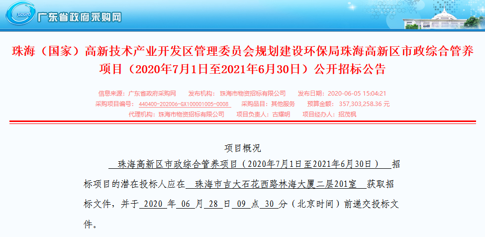 按照開標(biāo)計(jì)劃,6月28日,采購預(yù)算高達(dá)357,303,258.36元/年的珠海高新區(qū)市政綜合管養(yǎng)項(xiàng)目將公布中標(biāo)結(jié)果。