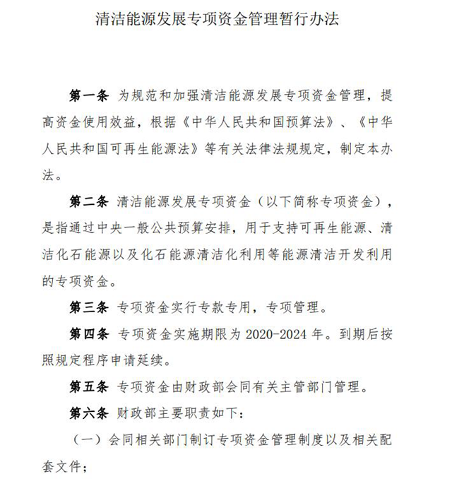 近日,財(cái)政部印發(fā)《清潔能源發(fā)展專項(xiàng)資金管理暫行辦法》,其中顯示專項(xiàng)資金實(shí)施期限為2020-2024年。