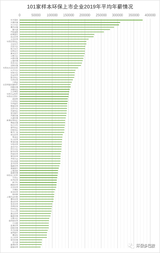 個人認為這是兩個正面因素和一個負面因素的疊加。兩個正面因素一為,行業(yè)中出現(xiàn)了一些對高端人才更具吸引力的非環(huán)保上市企業(yè)組織,如長江環(huán)保集團、江蘇環(huán)保產(chǎn)業(yè)集團、布局環(huán)保的大國企央企等。二為,積累了足夠資源跳出環(huán)保上市公司轉(zhuǎn)而創(chuàng)業(yè)的人群。這部分人數(shù)難以客觀統(tǒng)計,但相信諸位的圈子里一定就有這兩年跳出來創(chuàng)業(yè)的朋友,總數(shù)應該也不少。負面因素為,數(shù)量不少環(huán)保上市企業(yè)內(nèi)部實實在在的變化真的讓一些人或主動或被動選擇離開,甚至轉(zhuǎn)行,這也是無法回避的事實。終于要討論到收入了,直奔主題:環(huán)保上市公司的薪酬情況如何?本文整理了101家樣本環(huán)保上市公司(在前文人員工統(tǒng)計分析102家樣本基礎(chǔ)上再次剔除異常值“科林環(huán)?!保┑男劫Y支付現(xiàn)金流數(shù)據(jù),即年報現(xiàn)金流量表“支付給職工以及為職工支付的現(xiàn)金”科目。(注:支付給職工以及為職工支付的現(xiàn)金主要包括——本期實際支付給職工的工資、獎金、各種津貼和補貼等;以及為職工支付的養(yǎng)老、失業(yè)等社會保險基金、補充養(yǎng)老保險、企業(yè)為職工支付的商業(yè)保險金、住房公積金、支付給職工的住房困難補助,以及企業(yè)支付給職工或為職工支付的福利費用等)將結(jié)果與員工人數(shù)相除,得到企業(yè)薪酬圖表。