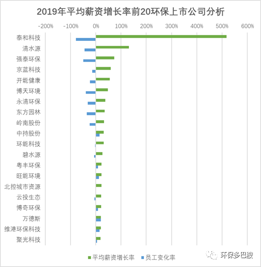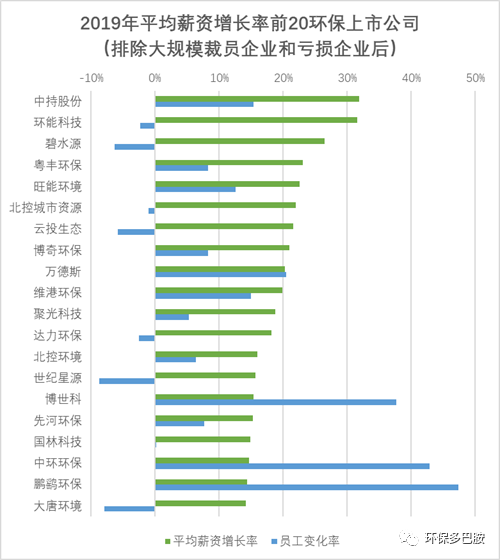 多就是多,少就是少,在此沒有必要對個別企業(yè)作單獨展開。咱說說整體情況,2019年,百余家環(huán)保上市公司為超過40萬員工支付的薪酬為464.8億元,平均年薪為11.41萬元,較2018年增長了1.84萬元。聽起來還不錯,但注意這是企業(yè)端的薪金成本,并非員工到手的收入,不精細地推算,對應員工平均月薪為稅前8300元。智聯(lián)招聘針對2019年冬季求職行業(yè)平均薪酬的調(diào)查數(shù)據(jù)顯示環(huán)保行業(yè)平均薪酬為8070元。將本文研究對象為水準偏高的環(huán)保上市公司這一因素考慮在內(nèi),兩個結(jié)果實際是高度吻合的。做環(huán)保的企業(yè),哪家還沒個Big Dream?當下的收入重要,未來的錢景,也即收入的增長勢頭也同樣重要。為此,我將2019年平均薪資增長率前20位的環(huán)保上市公司摘出,得到如下結(jié)果: