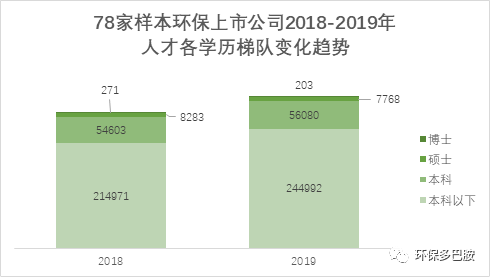 答案似乎是否定的。根據(jù)上市公司年報,2019年102家環(huán)保企業(yè)(統(tǒng)計口徑已在數(shù)據(jù)圖表中說明)員工總數(shù)為40.7萬人,較2018年增長10.5%。換言之,至少在上市公司這一環(huán)保產(chǎn)業(yè)中流砥柱群體,2019年的環(huán)保從業(yè)者總數(shù)并未因產(chǎn)業(yè)的波動而出現(xiàn)下降。首先,雖然行業(yè)整體從業(yè)員工總數(shù)增長,但2019年員工數(shù)減少的企業(yè)依然占了3成——33家。其次,3.9萬人的凈增長人數(shù),超過一半來自于僑銀環(huán)保這一家環(huán)衛(wèi)企業(yè)(注:由于是新IPO企業(yè),2018年員工數(shù)據(jù)使用的是招股說明書中2018年6月30日的數(shù)據(jù))。除開僑銀環(huán)保,101家環(huán)保上市公司2019年員工數(shù)增長不超過5%。和數(shù)量同樣重要的是質(zhì)量。A股上市公司年報中一般有針對員工群體學歷層次的詳細數(shù)據(jù)——這也是我們進一步分析環(huán)保企業(yè)人才結(jié)構(gòu)和變化趨勢的最好材料。這部分我們統(tǒng)計了有相關(guān)數(shù)據(jù)披露的78家環(huán)保上市公司數(shù)據(jù)(排除中國天楹的全部A股上市環(huán)保公司,包括盛運環(huán)保和有相關(guān)數(shù)據(jù)披露的港股綠色動力環(huán)保),得到的結(jié)果如下。顯而易見,上述環(huán)保從業(yè)者總數(shù)增長的結(jié)果主要來自本科以下的從業(yè)群體。所謂“高素質(zhì)人才”隊伍中,僅有本科員工有2.7%的增長。而碩博數(shù)都有所下降,特別是博士群體,人數(shù)直接減少了四分之一。