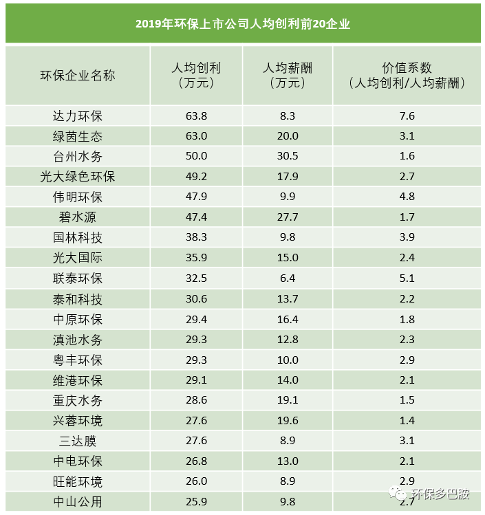 1)根據(jù)百余家環(huán)保上市公司2019年從業(yè)總?cè)藬?shù)40.7萬人,較2018年增長10.5%。并未發(fā)生從業(yè)人員大量減少情況;2)若拆分環(huán)保上市公司員工學歷構(gòu)成,博士、碩士群體數(shù)量有所減少;3)2019年環(huán)保上市公司整體平均年薪為11.4萬元,較2018年增長1.84萬元;4)2019年平均薪酬排名靠前的企業(yè)相當一部分來自于“人員優(yōu)化”,排除大規(guī)模裁員的企業(yè),薪資增長靠前的企業(yè)增長幅度可達30%,最突出的3家企業(yè)為中持環(huán)保、環(huán)能科技、碧水源;5)2019年上市公司員工人均創(chuàng)利水平為7.6萬元,既不如人均薪酬的11.4萬元,也較2018年人均創(chuàng)利數(shù)據(jù)的7.8萬元有所減少。做環(huán)保賺錢么?