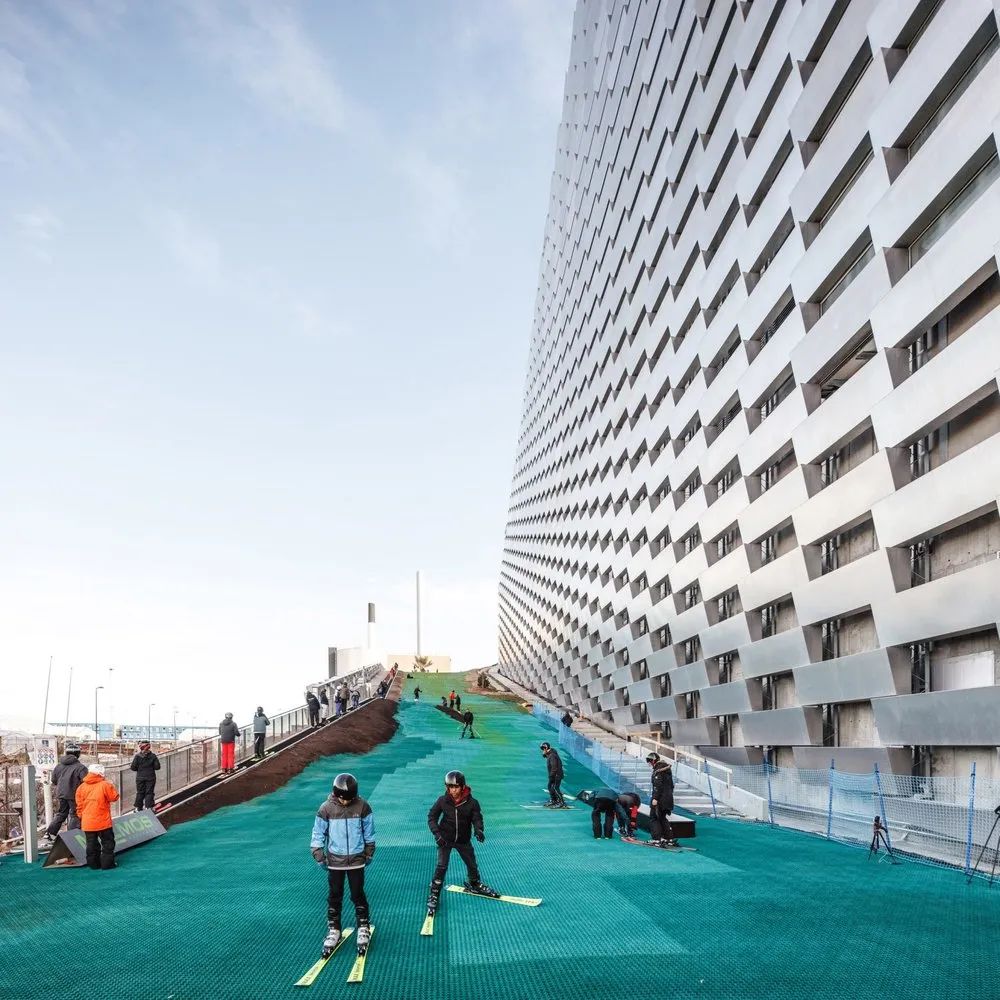 一座垃圾發(fā)電廠能改造出多少花頭,看完 CopenHill,真的被建筑師的腦洞驚艷到,400m 的屋頂滑雪場(chǎng)、公園步道、85m的人工攀巖墻、咖啡店、酒吧,每一處設(shè)計(jì)都在為當(dāng)?shù)厝嗣駧?lái)最放松的游玩體驗(yàn)。從最受矚目的滑雪場(chǎng)說(shuō)起,雖然丹麥氣候寒冷,但這里卻缺乏山脈,以前人們?yōu)榱嘶┲荒茯?qū)車幾百公里到瑞典滑雪。CopenHill 的出現(xiàn),讓哥本哈根擁有了第一個(gè)滑雪場(chǎng)不同于白雪皚皚的滑雪道,這個(gè)滑雪場(chǎng)放眼望去皆是綠色。這是一種特殊的合成材料,由一個(gè)個(gè)小的幾何單元構(gòu)成。