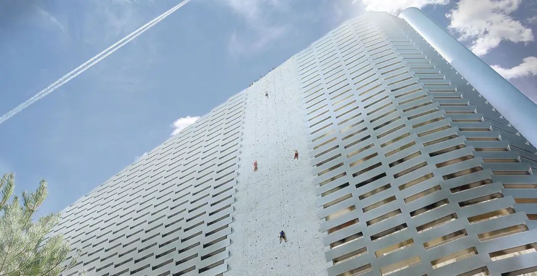 位于建筑的一側(cè),還有一個(gè)高 85m、寬 10m 的攀巖墻,它成功打破世界紀(jì)錄,成為最高的人工攀巖墻。它的設(shè)計(jì)類似于天然的山墻,用各種難度滿足不同程度攀巖者的需求。