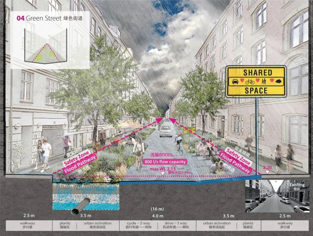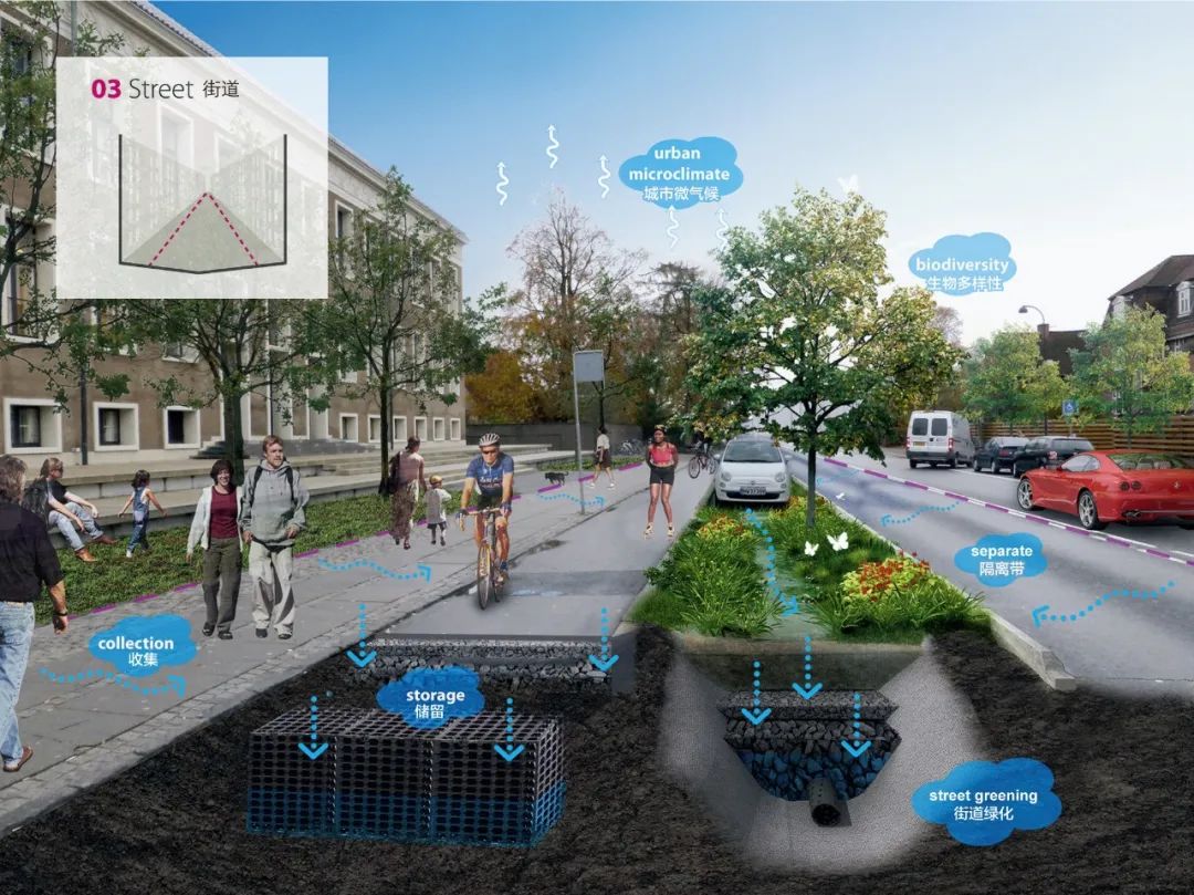 另一個(gè)用來(lái)緩解極端暴雨影響的具體策略是雨水滯留街道。這些街道通常是位于低洼、脆弱區(qū)域上游的次級(jí)道路,通過(guò)街道內(nèi)部的設(shè)計(jì)來(lái)創(chuàng)造巨大的蓄水空間。在不對(duì)交通產(chǎn)生重大妨礙的情況下,這些次級(jí)道路通常可被改造成雨水滯留街道。通過(guò)增加洼地、透水鋪裝等方式實(shí)現(xiàn)對(duì)雨水的滯留,并可以凈化雨水,從而實(shí)現(xiàn)對(duì)地下含水層的補(bǔ)給。