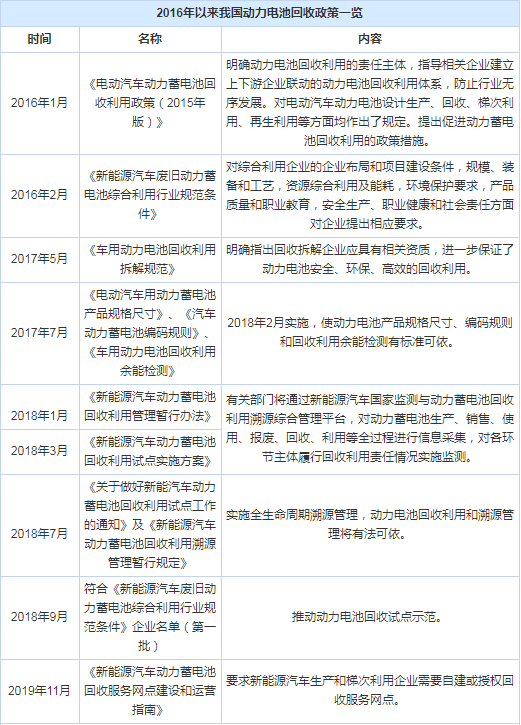2018年7月底,工信部就公布首批符合《新能源汽車廢舊動力蓄電池綜合利用行業(yè)規(guī)范條件》(簡稱《規(guī)范條件》)企業(yè)名單。2020年1月,工信部發(fā)布《規(guī)范條件(2019年本)》,對動力電池回收企業(yè)申報條件提出更多的要求。未來,會有更多符合電池回收條件的“白名單”企業(yè)。
