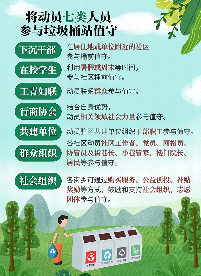 8月3日,北京市民政局副局長趙濟貴介紹,將動員七類人員下沉社區(qū)參加桶前值守,包括黨政機關和企事業(yè)單位干部、在校學生、工青婦聯(lián)團體、行商協(xié)會、街巷社區(qū)共建單位、群眾組織、社會組織。“社區(qū)首先利用好現(xiàn)有的垃圾分類指導員隊伍,加強管理和培訓,作為桶前值守的主力軍。同時,社區(qū)可組織樓門院長、網(wǎng)格員、黨員、熱心群眾等參與值守?!?/span>