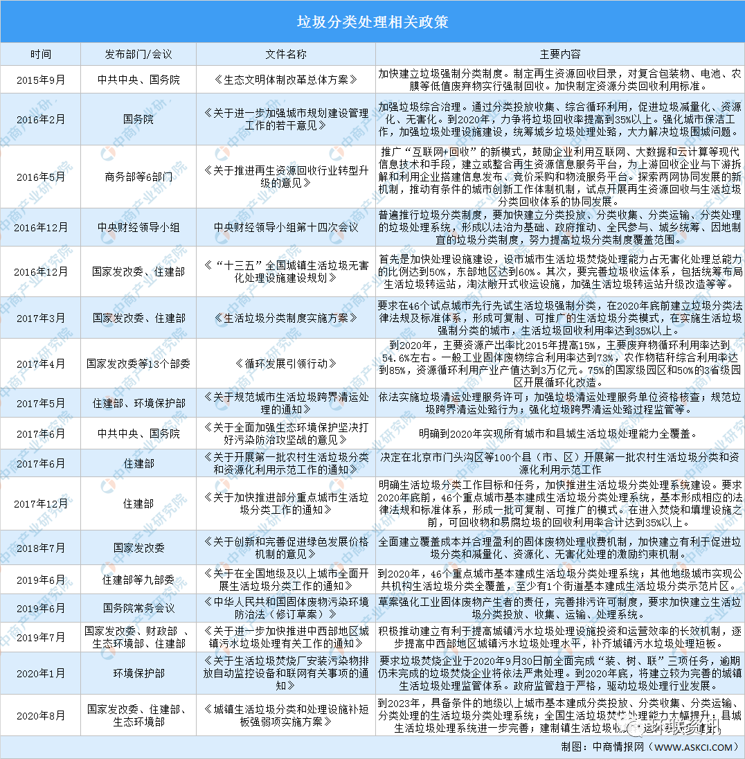 2020年1月,環(huán)境保護(hù)部印發(fā)《關(guān)于生活垃圾焚燒廠安裝污染物排放自動(dòng)監(jiān)控設(shè)備和聯(lián)網(wǎng)有關(guān)事項(xiàng)的通知》,要求垃圾焚燒企業(yè)于2020年9月30日前全面完成“裝、樹(shù)、聯(lián)”三項(xiàng)任務(wù),逾期仍未完成的垃圾焚燒企業(yè)將依法嚴(yán)肅處理。到2020年底,將建立較為完善的城鎮(zhèn)生活垃圾處理監(jiān)管體系。政府監(jiān)管趨于嚴(yán)格,驅(qū)動(dòng)垃圾處理行業(yè)發(fā)展。2020年8月,國(guó)家發(fā)展改革委、住房城鄉(xiāng)建設(shè)部、生態(tài)環(huán)境部聯(lián)合印發(fā)了《城鎮(zhèn)生活垃圾分類和處理設(shè)施補(bǔ)短板強(qiáng)弱項(xiàng)實(shí)施方案》,重點(diǎn)圍繞推進(jìn)垃圾分類投放、分類收集、分類運(yùn)輸、分類處理設(shè)施建設(shè)進(jìn)行部署?!冻擎?zhèn)生活垃圾分類和處理設(shè)施補(bǔ)短板強(qiáng)弱項(xiàng)實(shí)施方案》對(duì)于補(bǔ)齊生活垃圾分類處理能力缺口,推動(dòng)形成與經(jīng)濟(jì)社會(huì)發(fā)展相適應(yīng)的生活垃圾分類和處理體系意義重大。